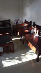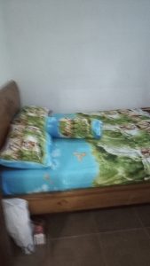 Kaptunk ide rízsfőzőt, ami az asztalon van, gáztűzhelyt 2 főzőfejjel, nagy hűtőt mélyhűtő résszel, viztároló edényt s ivóvizes ballont tele vízzel, összesen 6 szép képet a falakra… azóta szereltek fel szúnyoghálókat is fenti kis szellőző ablakokra.