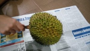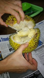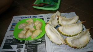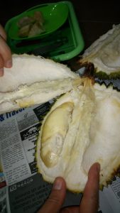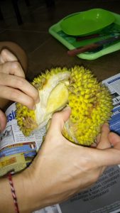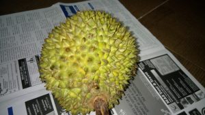 A durian megosztó gyümölcs ugyanis. Az ember vagy nagyon szereti, vagy ki nem állhatja, és hiába van egy vastag, tüskés, külső burka, a gyümölcshús átható illata / szaga 2-3 nylonszatyorba csomagolás ellenére is átüt mindenen, és belengi a teret. A múltkor a tetőteraszról megéreztem, hogy Gy. hazahozott egy duriant és letette a bejárati ajtó elé, egy emelettel lejjebb. Pedig szatyorban volt az is.