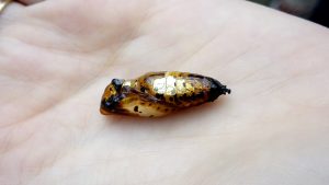 Egy adott időpontban szabadon is engedhettünk aznap kikelt pillangókat, megnézhettük a bábjaikat is. Ez itt egy arany színű báb, maga a burok átlátszó, belül a pillangó színe ilyen. Ezzel jelzi az állatoknak, amik esetleg meg akarják enni, hogy mérgező. Valódi arany volt a színe, mint egy kis ékszer.