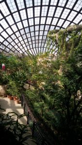 A páratartalom magas volt odabent, mindkettőnkről folyt a víz. Vannak bent kis, természetes szökőkutak, csobogók, vízesések, öntözik is folyamatosan a gazdag növényzetet egy központi rendszerről, minden nagyon modern és szervezett. Vannak tematikus részek, például a sáskákat bemutató tér. Ha az ember nem tudná, mit kell keresni, nem is biztos, hogy megtalálná őket a növényeken, olyan ügyesen rejtőznek. A vándorló levél nevű rovarok egy az egyben úgy néznek ki, mint egy levél, még kis elszáradt részük is van, hogy a lehető legélethűbbek legyenek.