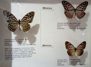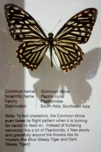 Az épület ezen részében sok-sok érdekes infó volt, minden fejlődési fázisról tanulhattunk valamit, voltak igazi pillangó tojások, bábok, mikroszkópban is láthattuk őket, meg aztán felnagyítva is, műanyagból megformázva. Voltak interaktív foglalkozások, érintőképernyős játékok és vetítés egy moziteremben. Nagyon érdekes volt. Ott fényképeztem pl. ezt a leírást, ami egy olyan pillangóról szól, aki utánozza két másik társát megjelenésben és viselkedésben is. Elsőként jöjjön az utánozós pillangó fényképe,