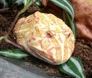 Ez a felettébb vidám teremtmény itt a Pacman béka, aki magányosan tengette napjait a terráriumban, habár a szomszéd lakosztályban ott volt mellette még egy ugyanilyen, de a kiírásból kiderült, hogy gyakran megeszik egymást, szóval lehet, hogy mindenkinek jobb ez így. Két Pacman béka egy csárdában nem fér meg.