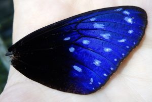Fényképeztem még nagyon sokat, de már csak pár képet teszek fel ide. Például egy szárnyat, amit egy sziklán találtam, és ami gyönyörűen váltott feketéből kékbe a napsütésben. A kék rész, ha nem esik rá fény, akkor teljesen fekete.