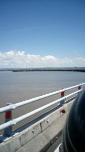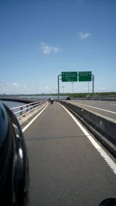 fantasztikus volt! Napsi előre szólt, külön sáv van a motorosoknak. Ám arra nem számítottam máshol is kell felmenni, így először az autópályára mentem de szerencsére rám dudáltak, s gyanús lett más motor nem megy arra… így visszafordultam. Napsi nézett utána a fizetésnek, így indulás előtt még Amlapúrában váltottunk E-kártyát, mert a pályán azzal kell fizetni. Aztán jött a motoros sáv, teljesen elkülönítve, a tenger felett…imádtam.