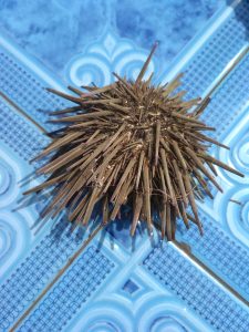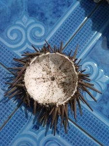 És Napsi elment vadászni a partra kagylókra, csigaházakra, s addig egyszer csak August megint odatotyogott hozzám s akkor fel tudtam venni. Majd Napsi boldogan mutatott visszatérte után egy hatalmas fél tengeri sünit, amit talált. Megvoltak még a tüskéi is!