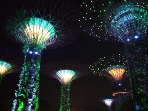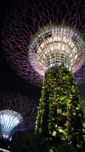 Aztán az épületből kilépve elsétáltunk a szabadtéri óriás fákig, látjátok majd a fotókon, ezek fémből készült tornyok gyakorlatilag, amiket befuttatnak zöld növényekkel. Nappal is nagyon szépek,