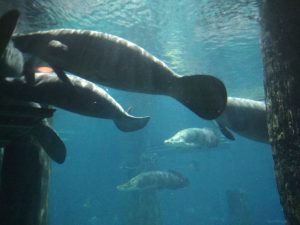 Jaj, ki ne felejtsem, hogy Gy. életében először találkozhatott a kedvenc állatával! Egy hatalmas akvárium mellett mentünk el, amikor felragyogott az arca, és örömében felkiáltott, hogy „Tengeri tehén! A kedvenc állatom!!!” Nem is tudtam, hogy ilyen közel állnak a szívéhez a tengeri tehenek, de mondta, hogy gyerekkorában sokat olvasott róluk. Itt manátuszok voltak, akik nagyon hasonlítanak a dugongokra, ez a két fajta állat a tengeri tehenek rendjébe tartozik. Sziréneknek is hívják őket. 🙂 Csináltunk sok képet róluk, és le lehetett menni a föld alá, az akvárium oldalához, ahol üdvözölte is az egyikük Gy-t, odaúszott hozzá közel és megszemlélte, majd elúszott. 🙂
