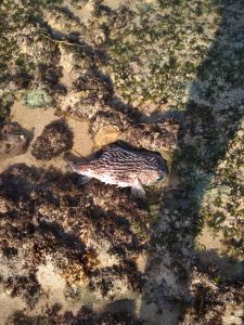 Egyik nap már visszafelé sétáltunk, mikor egy kicsi vizmaradványban egy nagyobb halat vettünk észre – még élt, de látható volt, a dagály mire ideér, kiszárad. Sajnos nem kaphattam fel hogy vigyem a tengerhez, mert tüskéi voltak, a testéhez hátrasimulva de nem volt kétségem afelől ha megfogom, a tüskék veszélyesek lehetnek.