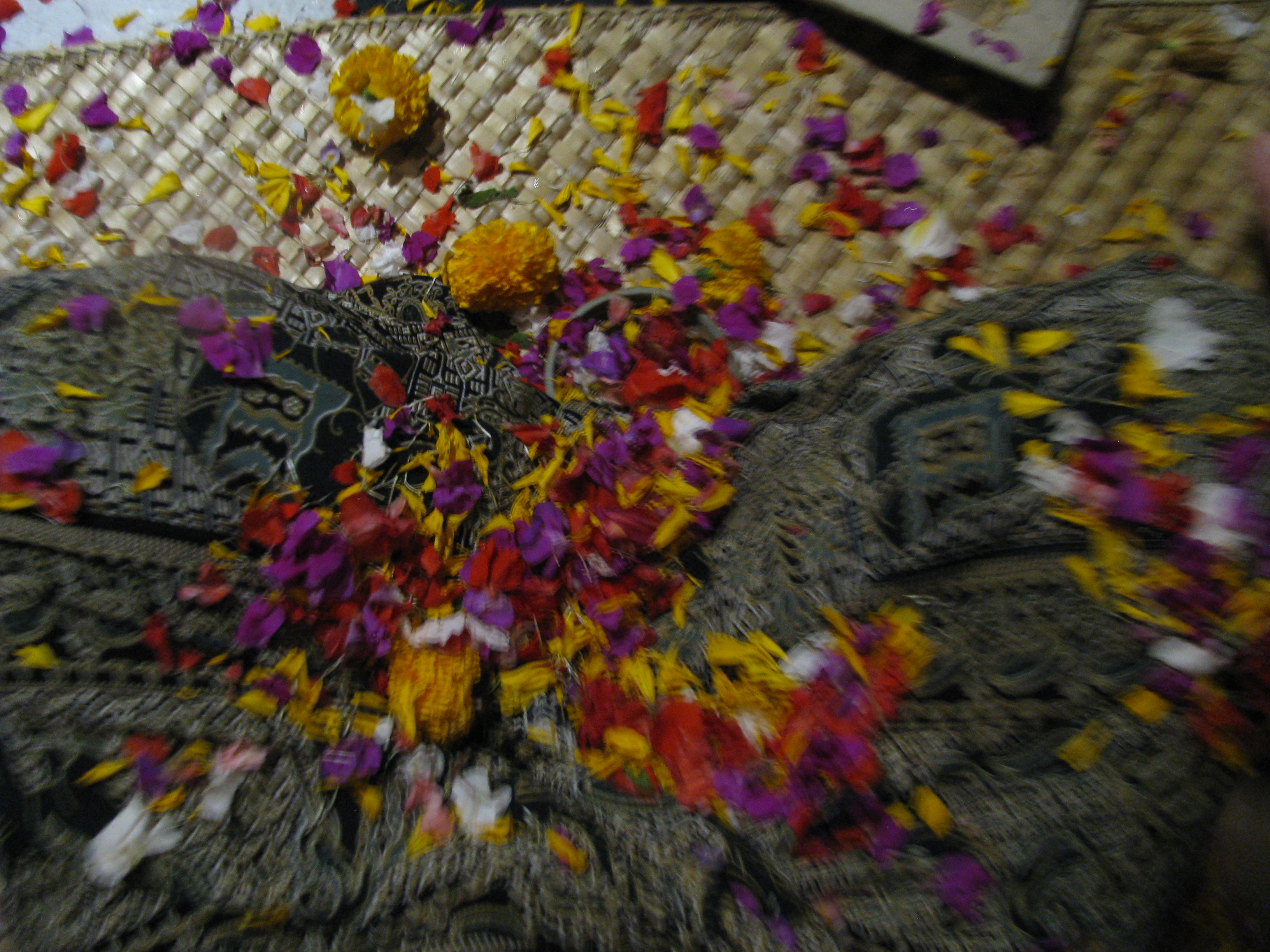 Gy-val anno használtuk ilyen kosárkákat minden nap az amlapurai házunkban, naponta egyszer elvégeztük a szertartásos felajánlást, amikor füstölőt gyújtottunk, amit rátettünk a virágkosárkákra és szenteltvízzel is meghintettük azokat, amikor letettünk őket a ház kapuja elé, az oltárokra és azok lábához is. De még soha nem vettem részt az elkészítésükben, nagyon érdekes, nem gondoltam, hogy így tűzik össze őket.