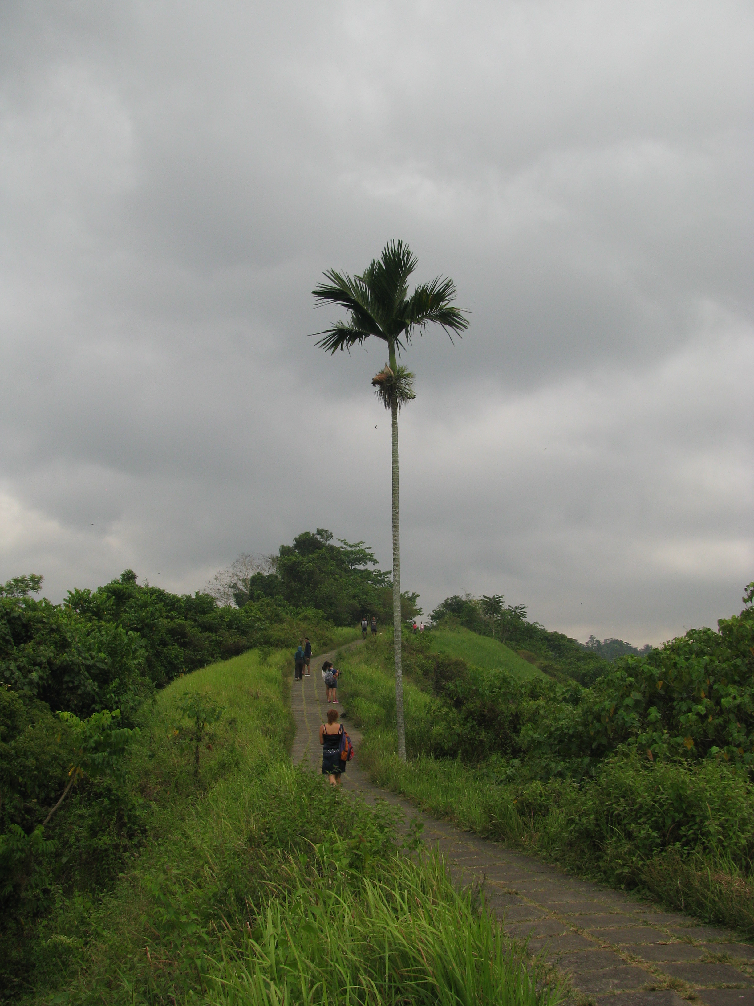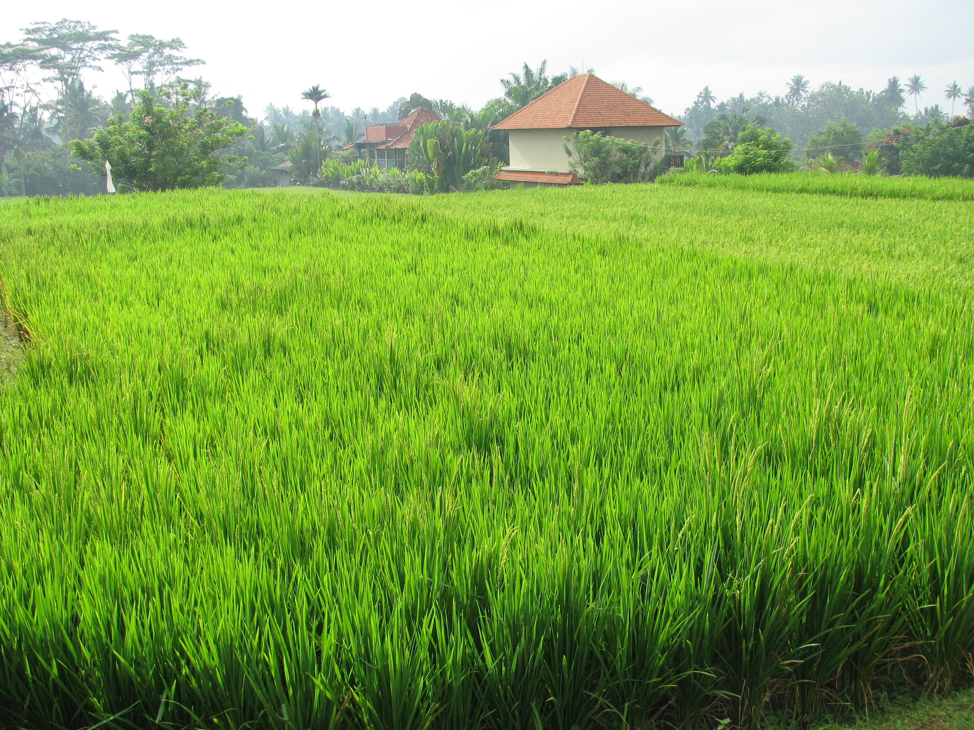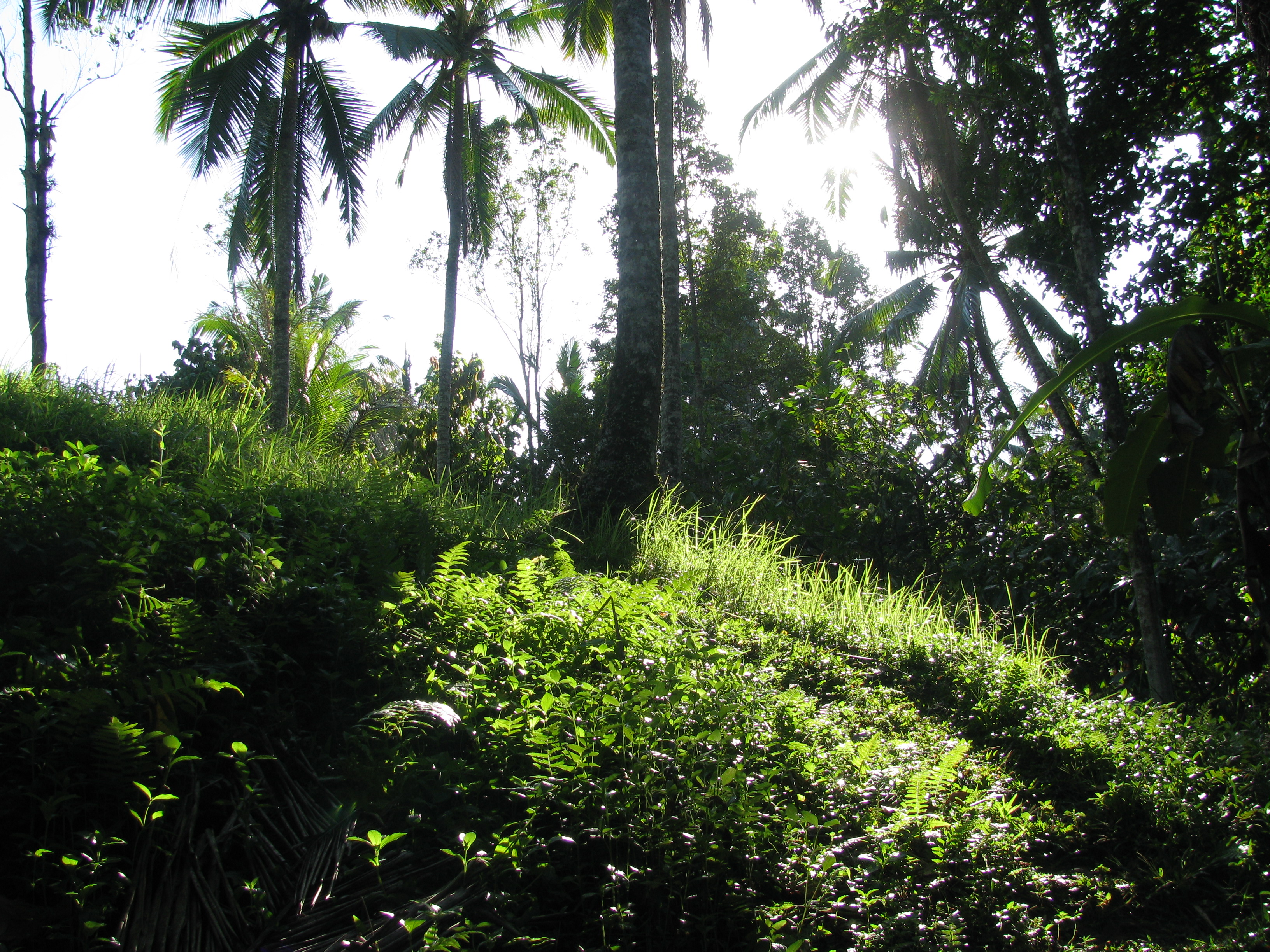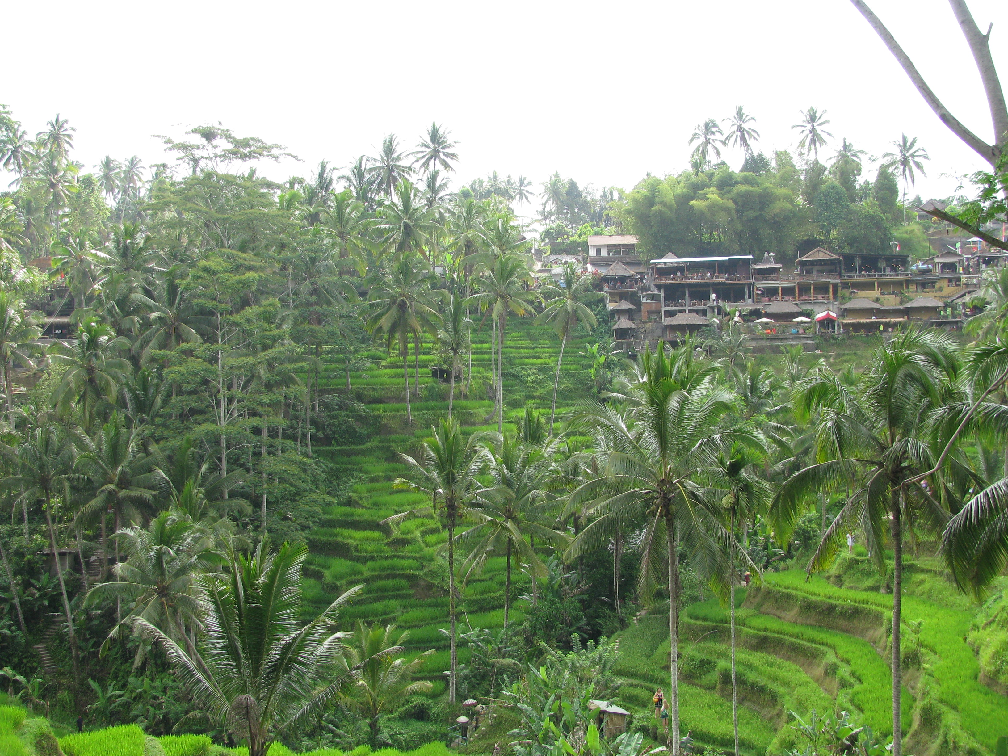 Másnap reggel erdei sétára mentünk, rizsmezők mellett vezetett az utunk, és láttunk durianfát, kakaófát (a friss kakaóbabot meg is kóstolhattuk, egy fehér, nyálkás, kicsit édeskés-savanykás belsejű gyümölcs), ananász bokrot, megálltunk sült banánt falatozni egy háznál és balinéz kávét inni, tök jó volt. A balinéz kávé olyan, hogy az őrölt kávét leforrázzák, majd hagyják a zaccot leülepedni, és a tetejéről isszák le a kávét. Ha az ember cukrot vagy tejet tesz bele és felkavarja, várni kell egy kicsit, amíg újra leülepszik. De jöjjenek a képek a reggeli sétáról. A rizsmezőn még megült a hajnali harmat: