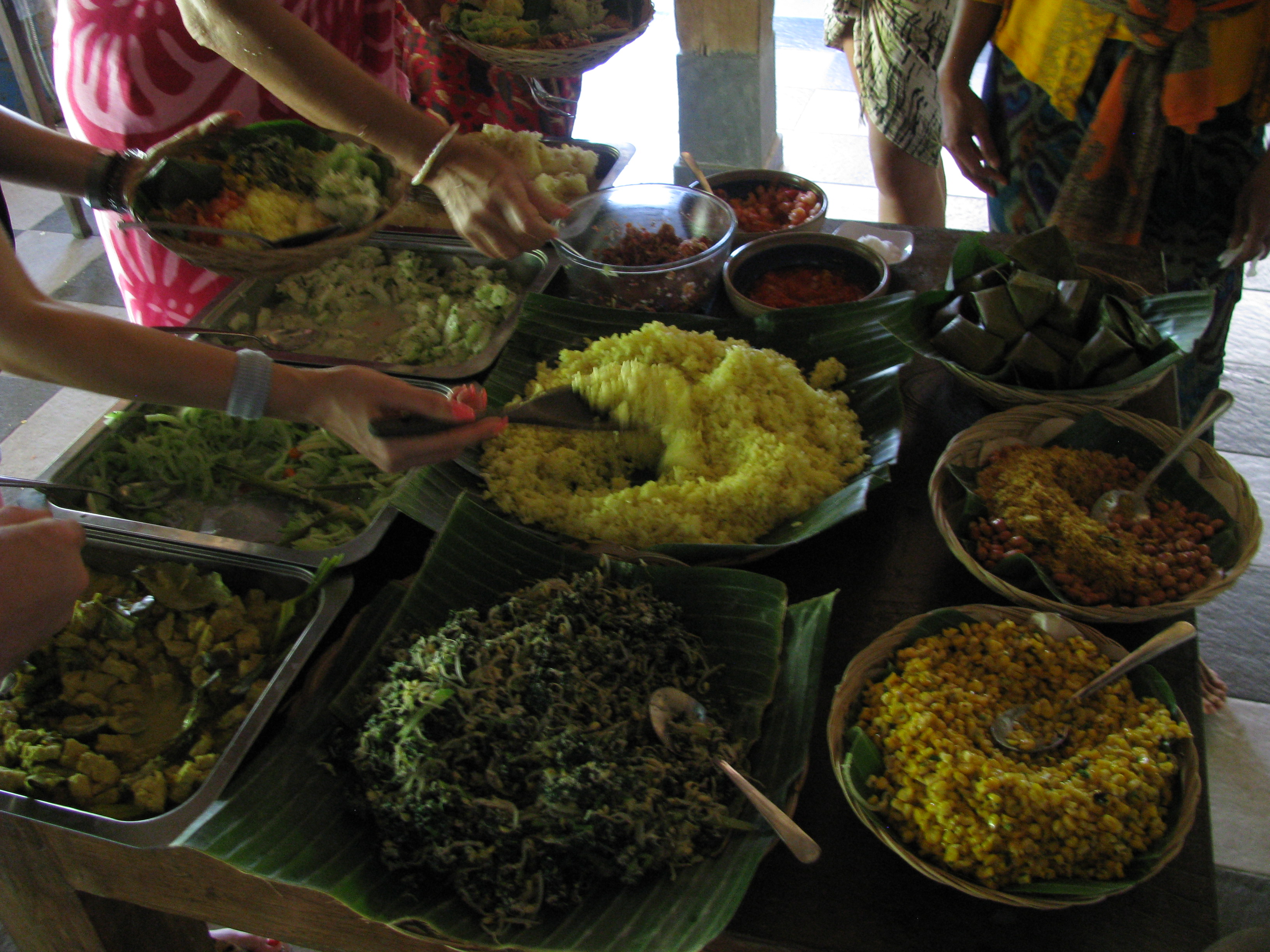 Egy kis faluba utaztunk át másnap, most váltottunk először szállást, egész idáig Ududban laktunk. A falucskában egyet aludtunk. Itt főzőiskola volt az első nap délutánján a program, a helyi nők pikk-pakk összeütöttek egy csomó rendkívül finom fogást, mi meg segédkeztünk nekik a főzésben, de azért túl nagy részt nem vettünk ki a munkából, olyan gyorsan és hatékonyan dolgoztak. 🙂 Itt az eredmény:
