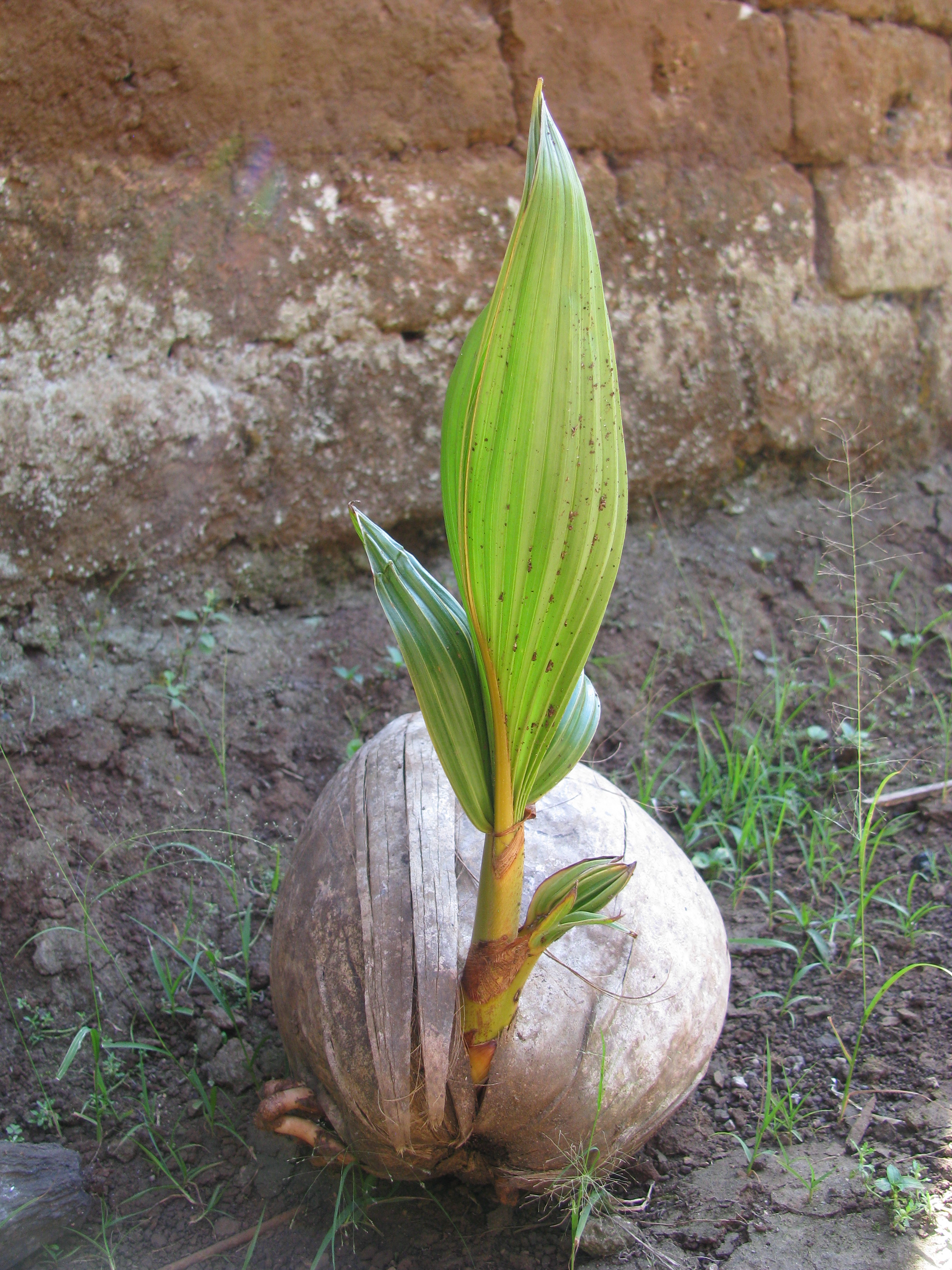 Útközben behívtak minket egy házikóba, ahol pálmacukrot készítettek, többen közülünk vettek is. Ezt folyékony állapotban egy fél kókuszdió héjába öntik, így az összeállt cukor végül kisebb, félgömb alakú adagokban vásárolható meg. Képet elfelejtettem csinálni, csak egy kirügyezett kókuszdiót örökítettem meg a kertben: