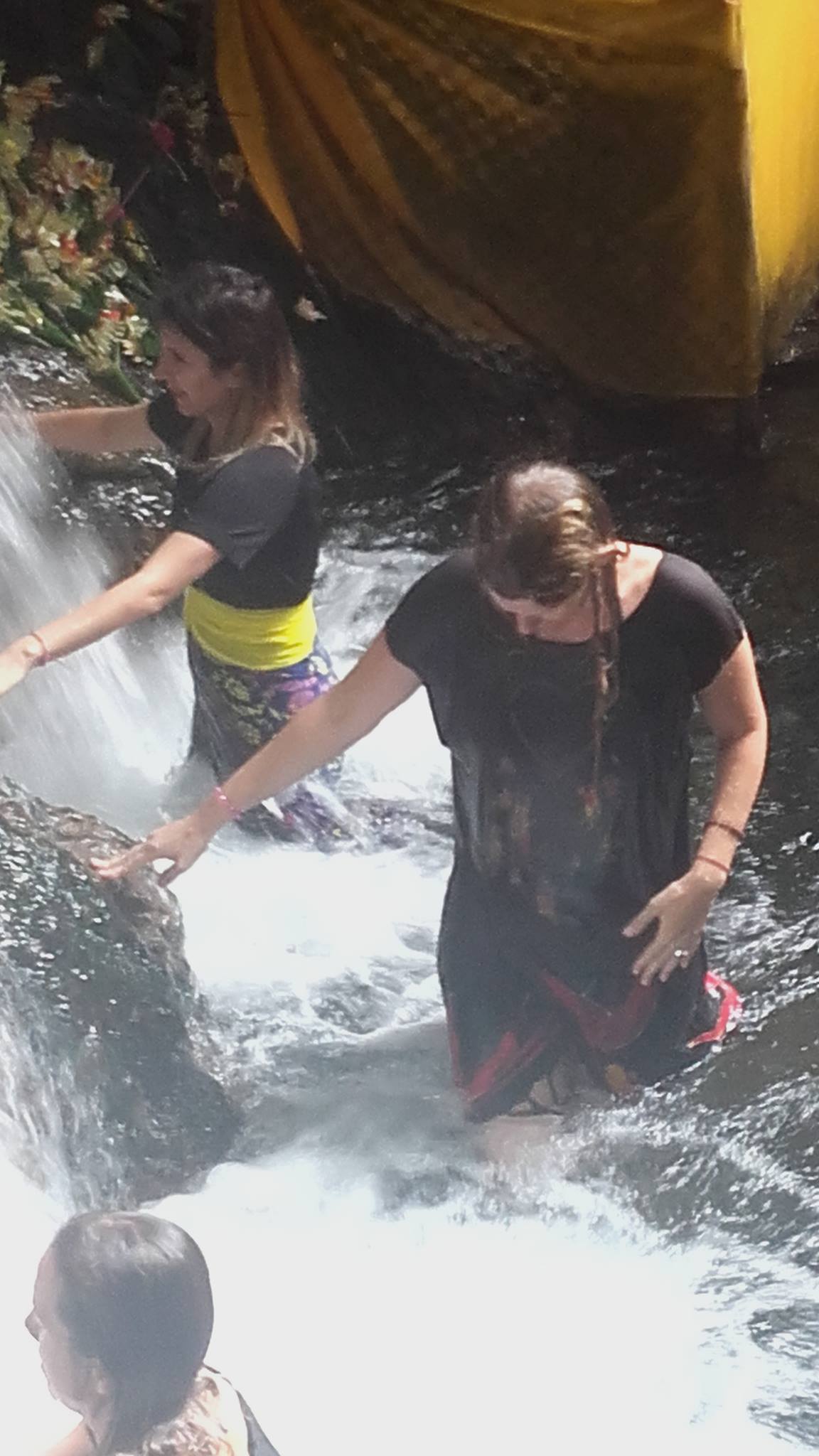 Másnap reggel pedig vízszertartással kezdtük a napot. Egy szent vízesésben fürödtünk meg, ahová a helyiek is járnak tisztulni. Sok lépcső vitt le a patakhoz, több szentély mellett is elhaladtunk útközben, ahol kis virágkosárkákat, füstölőket hagytunk ott felajánlásként. A patak hűs vizében állva várakoztunk a sorunkra, hogy a vízesés alá álhassunk. Nagy erővel zúdul bele a patakba a víz, szinte nehéz aláállni, olyan ereje van. És hideg is. 🙂 De megéri, mert nagyon jó, felszabadult érzés keríti utána hatalmába az embert.