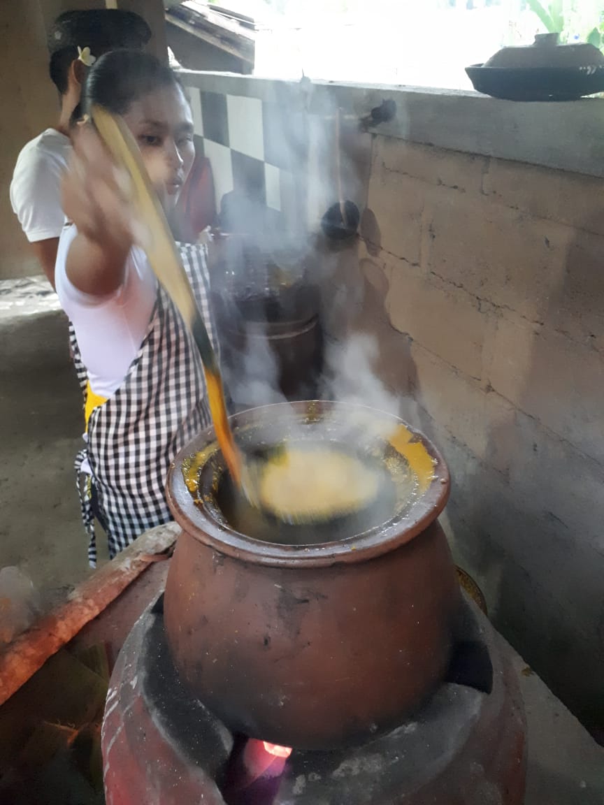 A következő program a kókuszolaj és kurkumás gyógyital készítése volt egy helyi fiatal házaspárral, akik nagyon finom ebéddel vártak minket az otthonukban, és aztán együtt készítettük el a fent említett dolgokat. Egy öreg kókuszdiót törtek fel, amiben a kókuszhús jó vastag volt, azt reszeltük le egy fakéregből készült gyalun (majd aztán rendes reszelőn, mert bár tök jól működött a gyalu is, gyorsabb volt azért a fém reszelő). Egyébként az eszközök nagy része kézzel készített volt, pl. fél kókuszból csináltak szedőkanalat. Beáztattuk vízbe kétszer is a kókuszreszeléket, majd kinyomkodtuk a levét, ebből lett a kókusztej, amit aztán feltettünk a tűzre forrni, és a végén óvatosan lefölöztük a pöttyökben megjelenő kókuszolajat a felszínéről. Mint egy húslevesen a zsírpöttyöket, úgy képzeljétek el. A kinyomkodott kókuszreszelék sem veszett kárba, tofu-szerű dolgot tudnak belőle készíteni.