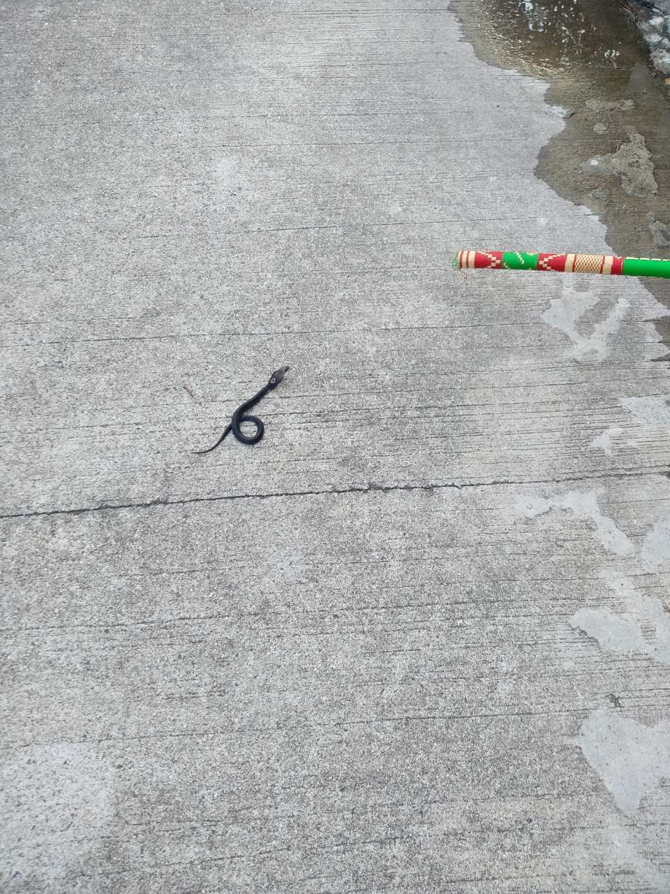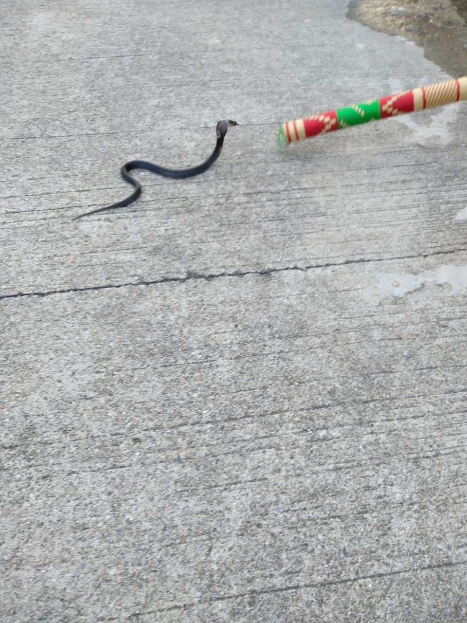 Egyik nap egy halott kis kobrakigyót találtam a baloldali szomszéd, most üres ház előtt. Délután pedig arra figyeltem fel, a szembe szomszéd egy másik kis kobrát próbál távoltartani a kertjétől s házától,