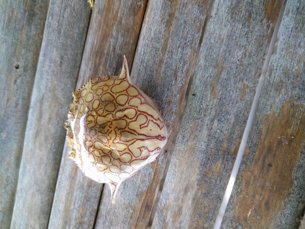 A nagy hőségben ismét sok rák főtt meg a csigaházakban vagy az oduik környékén, elevenen. Alig néhányat lehetett megmenteni közülük. Egy másik parton, a kávézós helynél találtunk egy olyan halott halat, amelyik a hasunkhoz szokott simulni mikor úszunk. S Napsi talált ilyen szép rákpáncélt: