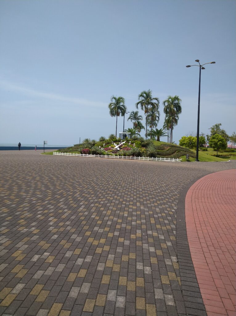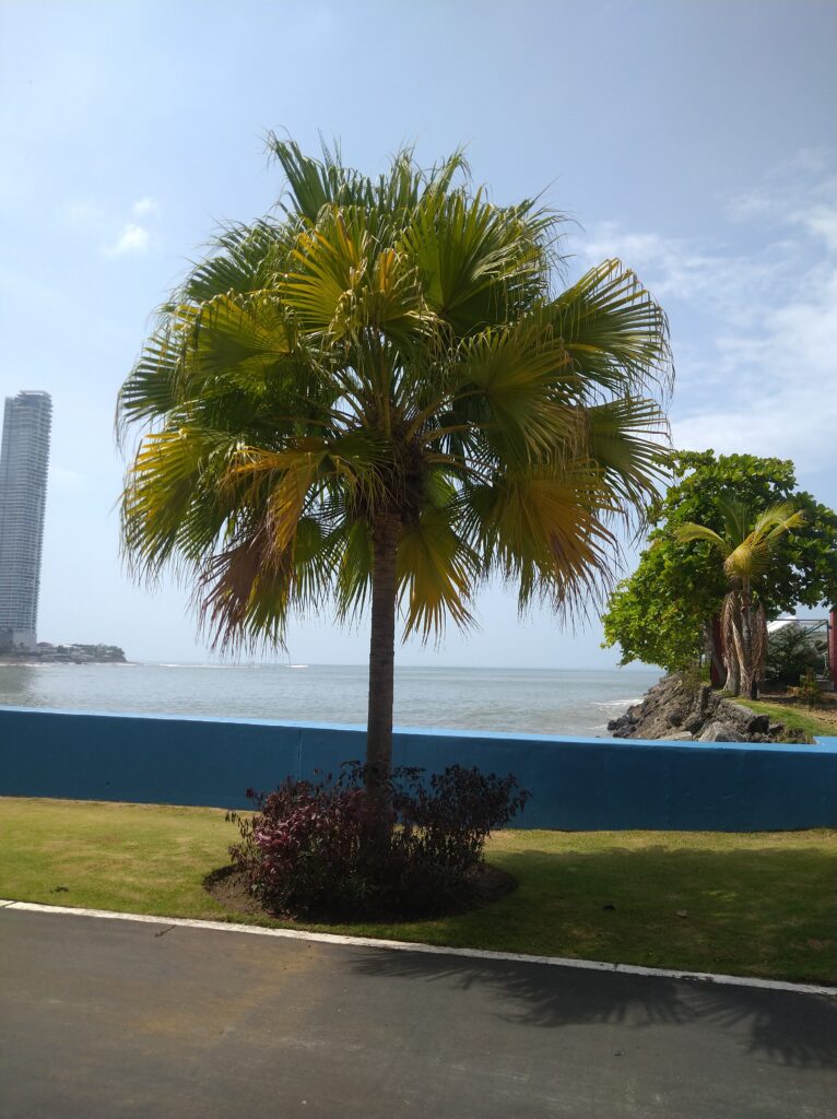 Gyalog mentünk a tűző napon kb másfél órát, 10 óra 20-as indulással. A tengerparti sétányon lassan haladtunk, sokat fotóztunk, filmeztünk. Szép pálmafákat, madarakat, a tengerpartot…
