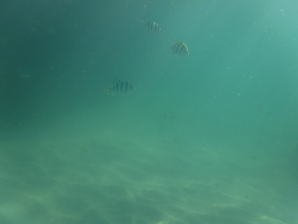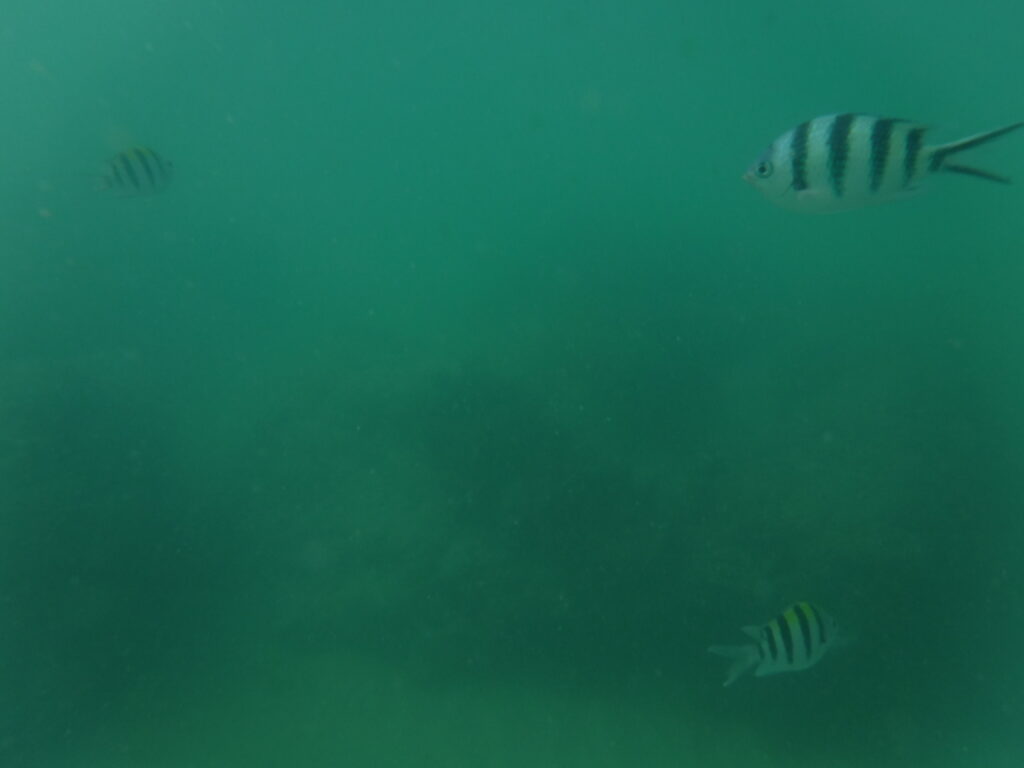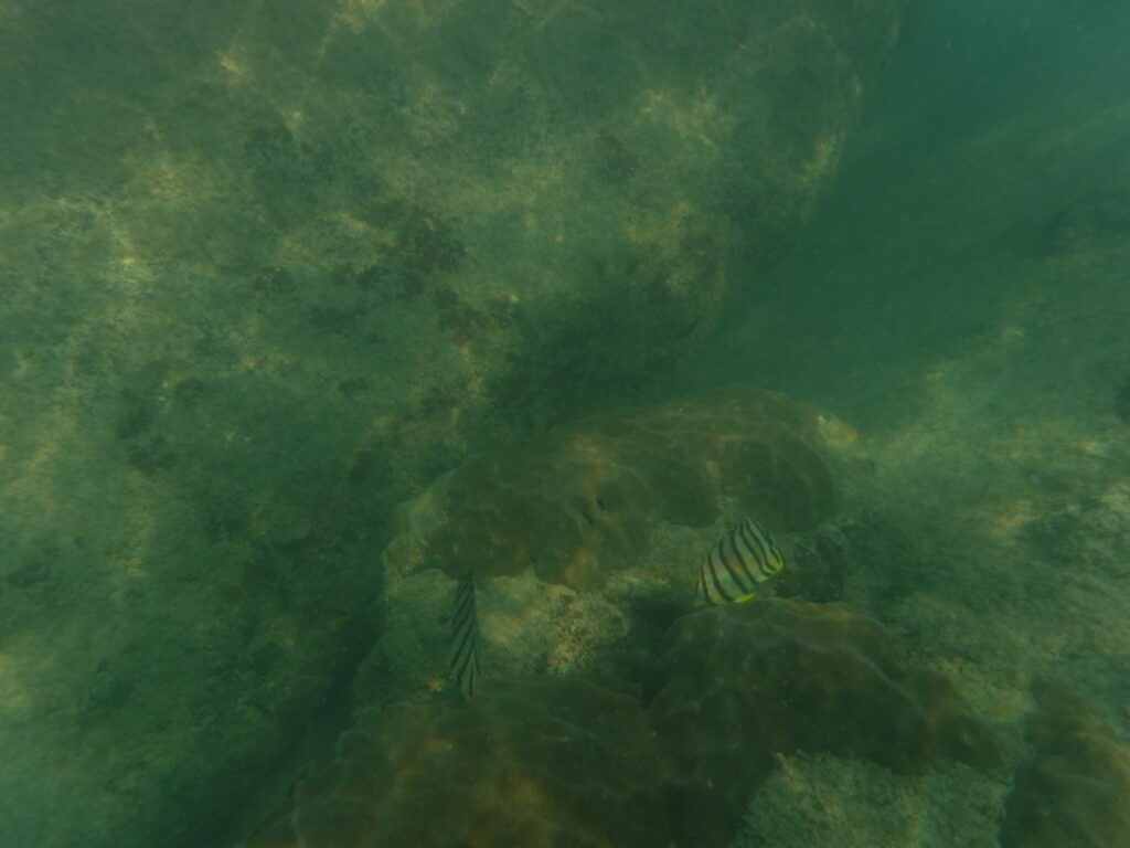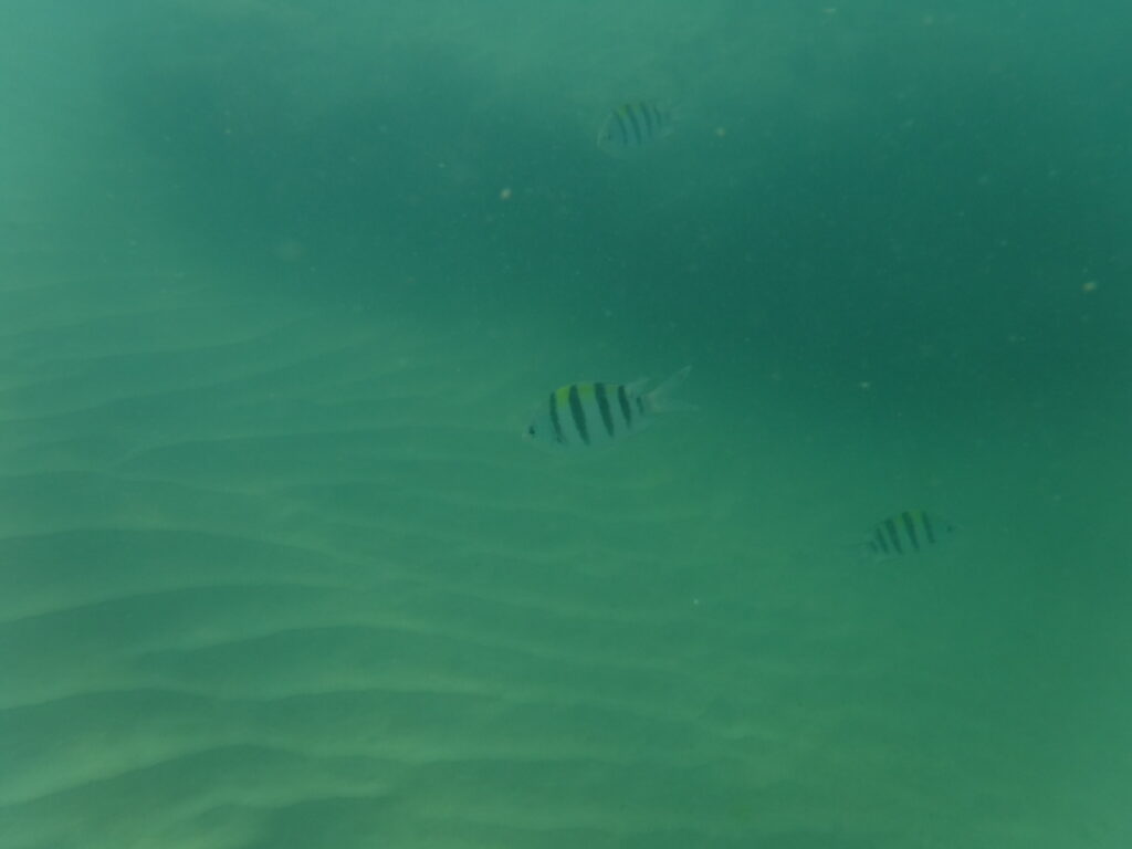 De tojtunk rá, visszamentünk a vizbe s mikor már kifelé úsztam, Napsi mutatta nekem a kezével hogy HALAK vannak! Ugyanis apály lett s Napsi észrevett pár szép csíkos trópusi halat! A viz továbbra is zavaros volt, homokszemcsékkel tele, belehullott falevelek is akadályozták a látást, nem ezt mutatják a reklámokban. Napsi nekem is hozott búvárszemüveget, feltettem s ott voltak ezek a drága, aranyos halacskák! Ahogy tovább úsztam előre, találtam egy sziklát, s rengeteg hal volt a közelében, s mellette már látszott egy korall is – ugyanis közben apály kezdődött s igy már érthető volt, ez tényleg lehet jó snorkos hely. A vizben eléggé mostoha körülmények között sikerült Napsinak az uj gépével – ezzel: