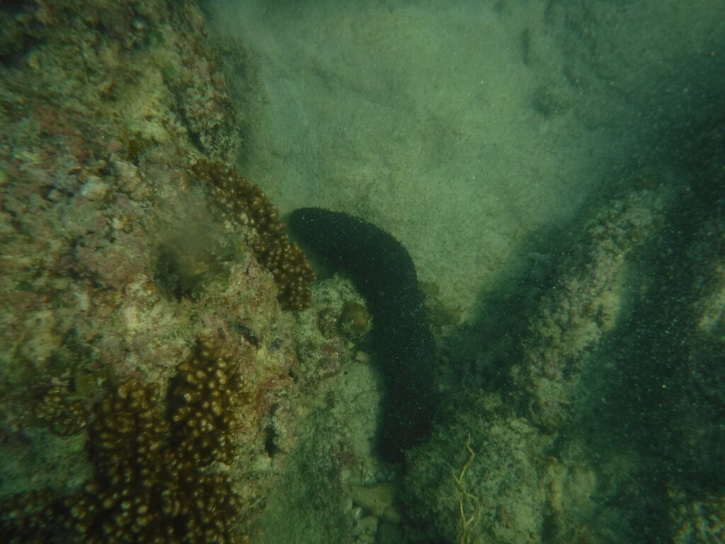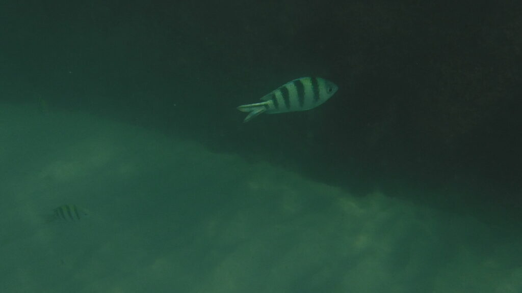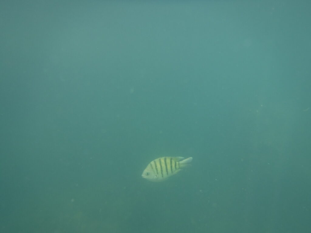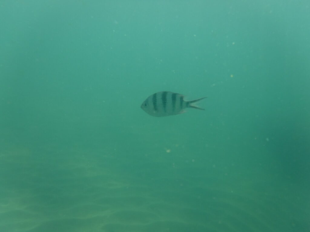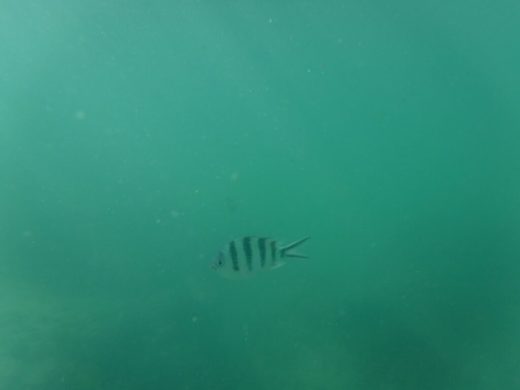 De tojtunk rá, visszamentünk a vizbe s mikor már kifelé úsztam, Napsi mutatta nekem a kezével hogy HALAK vannak! Ugyanis apály lett s Napsi észrevett pár szép csíkos trópusi halat! A viz továbbra is zavaros volt, homokszemcsékkel tele, belehullott falevelek is akadályozták a látást, nem ezt mutatják a reklámokban. Napsi nekem is hozott búvárszemüveget, feltettem s ott voltak ezek a drága, aranyos halacskák! Ahogy tovább úsztam előre, találtam egy sziklát, s rengeteg hal volt a közelében, s mellette már látszott egy korall is – ugyanis közben apály kezdődött s igy már érthető volt, ez tényleg lehet jó snorkos hely. A vizben eléggé mostoha körülmények között sikerült Napsinak az uj gépével – ezzel: