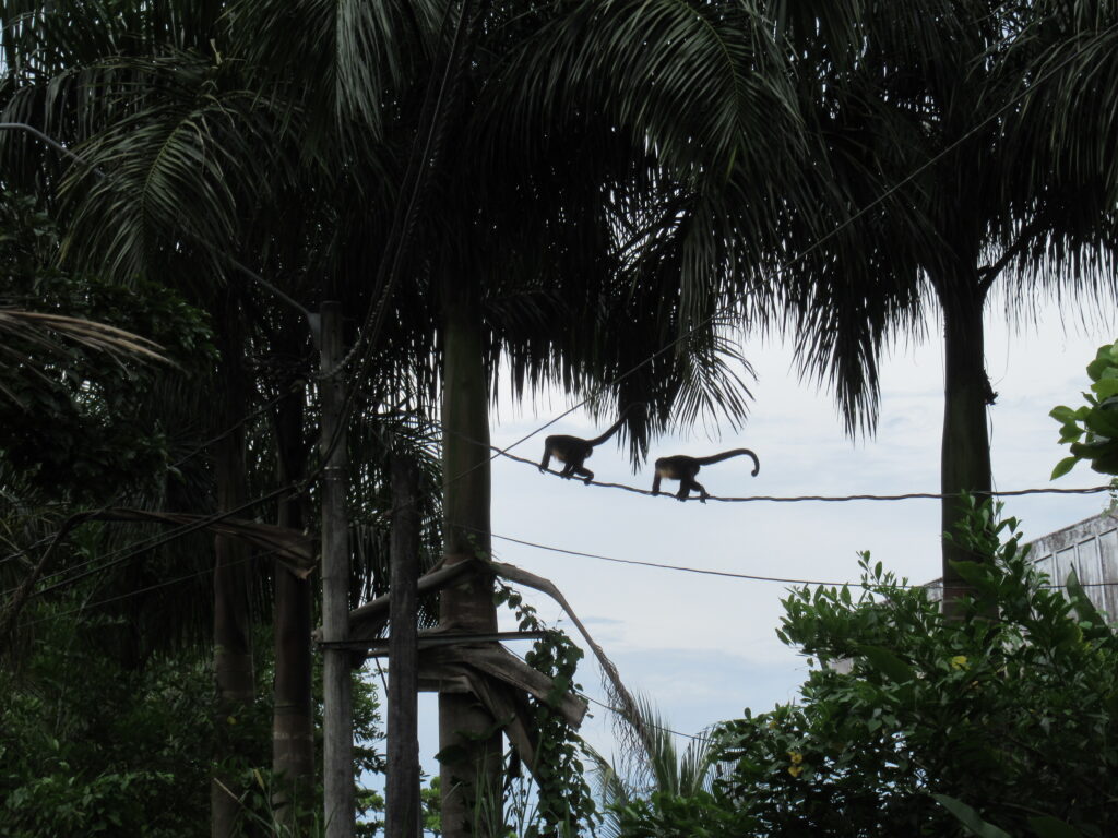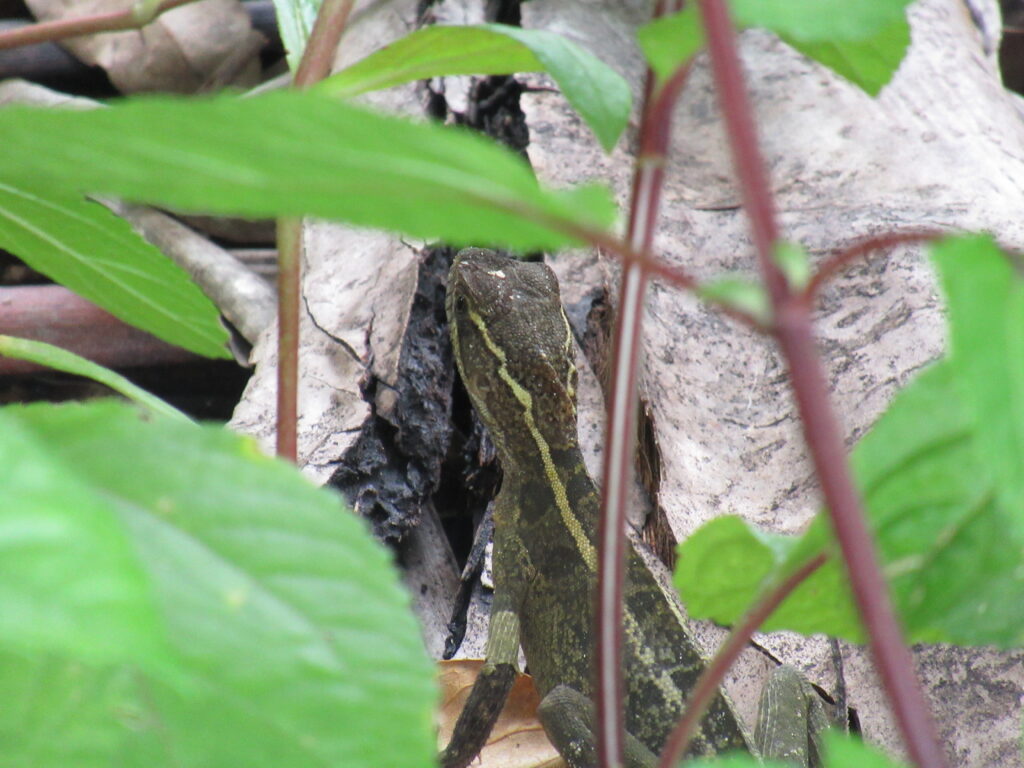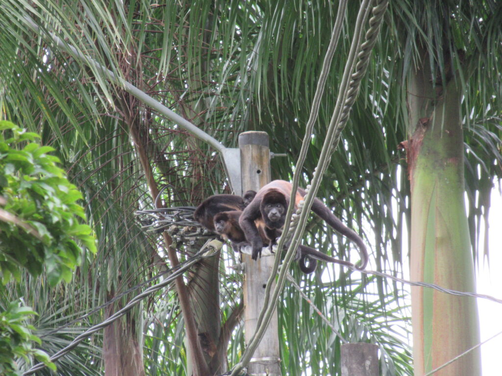 Első túránk volt a legemlékezetesebb… Először elhagytuk a sokszor bűzölgő partunkat, majd jön egy korábban úszásra alkalmas partész – sajnos mára ezt is a tenger moszatai lepik el – majd következik egy horgászásra alkalmas terület, ahol stégek vannak, és elérünk a Hotel Tortugához. Most nem lehet bemenni, s innen a jóval távolabbi partok is lehet el vannak zárva, mert valami jungel-túlélő showt forgatnak itt éppen. Tőle 200 m-re már az őserdő szélén haladunk tovább. S itt találkoztunk a legalább 20 tagú bőgőmajom csapattal, akik a forgalmas út felett keltek át éppen a tengerpart felől, sztrádának használva a villanyvezetékeket. Nagyon ügyesek voltak, végül a villanyvezetékről egyenként ugrottak át a szemközti fa egyik lehajló ágára. A nőstény majmok közül az anyukák hátukon a pici kölykökkel hajtották végre ezt az ugrást – nem értettük a kicsik hogynem zuhannak le – végül kiderült Napsi felvételei alapján a megoldás. Az anyamajom farka tövére csavarják a kismajmok a saját farkukat, szorosan – azzal is kapaszkodnak, nem csak a kis mancsukkal a mama szőrébe. Sok időt töltöttünk el bámulva őket ahogy átkelnek sorban az úton, s leállt a közlekedés is, az autók megálltak ne zavarják meg őket. Ilyet a helyiek is ritkán látnak, hát kiszálltak az autókból s nézték őket, csodálták, mint mi is. Aztán mindenki ment tovább. Láttunk szép madarakat, pillangókat, sisakos leguén félét aki hagyta magát egészen közelről lefotózni, pelikánokat lecsapni a tengerre s enni utána a halat… s mikor elértük a beach elejét, máris a parton szedhettük a szép tengeri sün házakat, egy ritkát is sikerült már találni. Sok itt a rákocska, ha nyugton maradunk, egy idő után előbújnak, öszebarátkozunk szinte. Nagyon szép nagy példányok is élnek erre…
