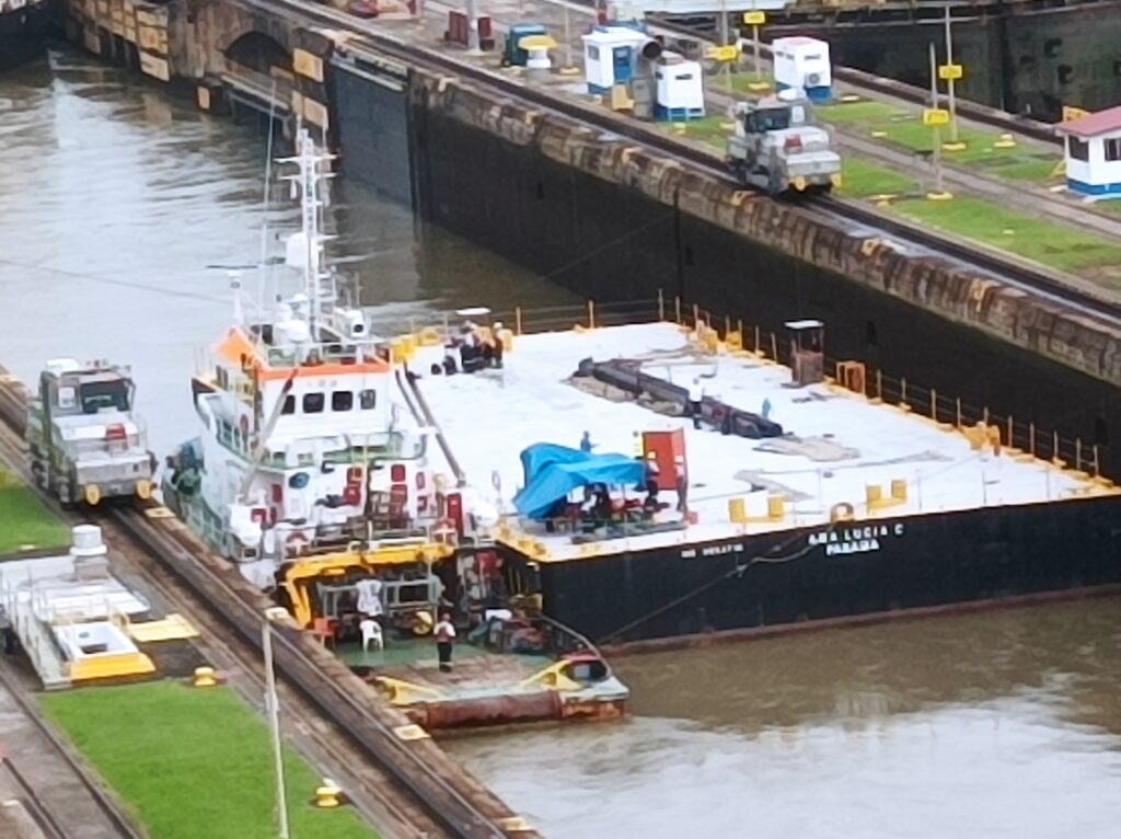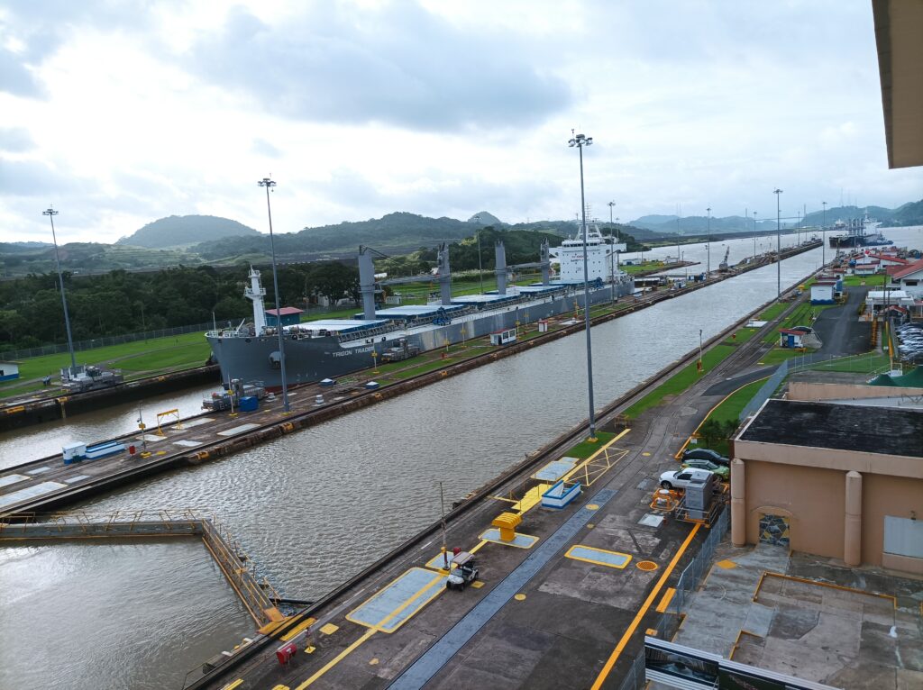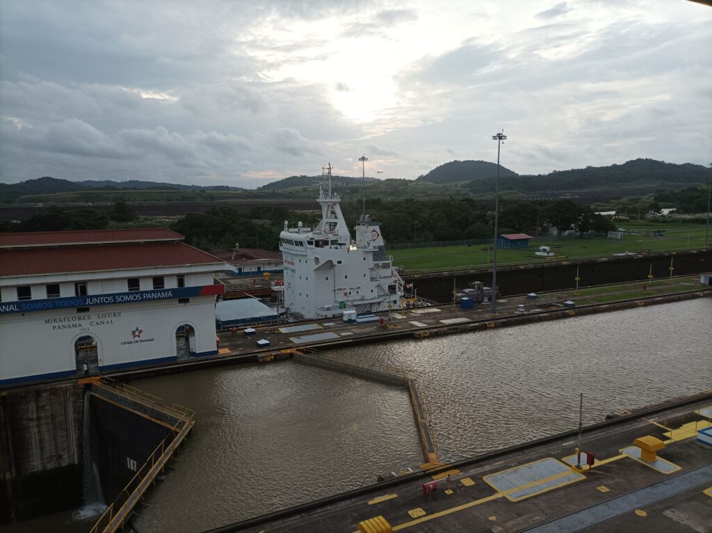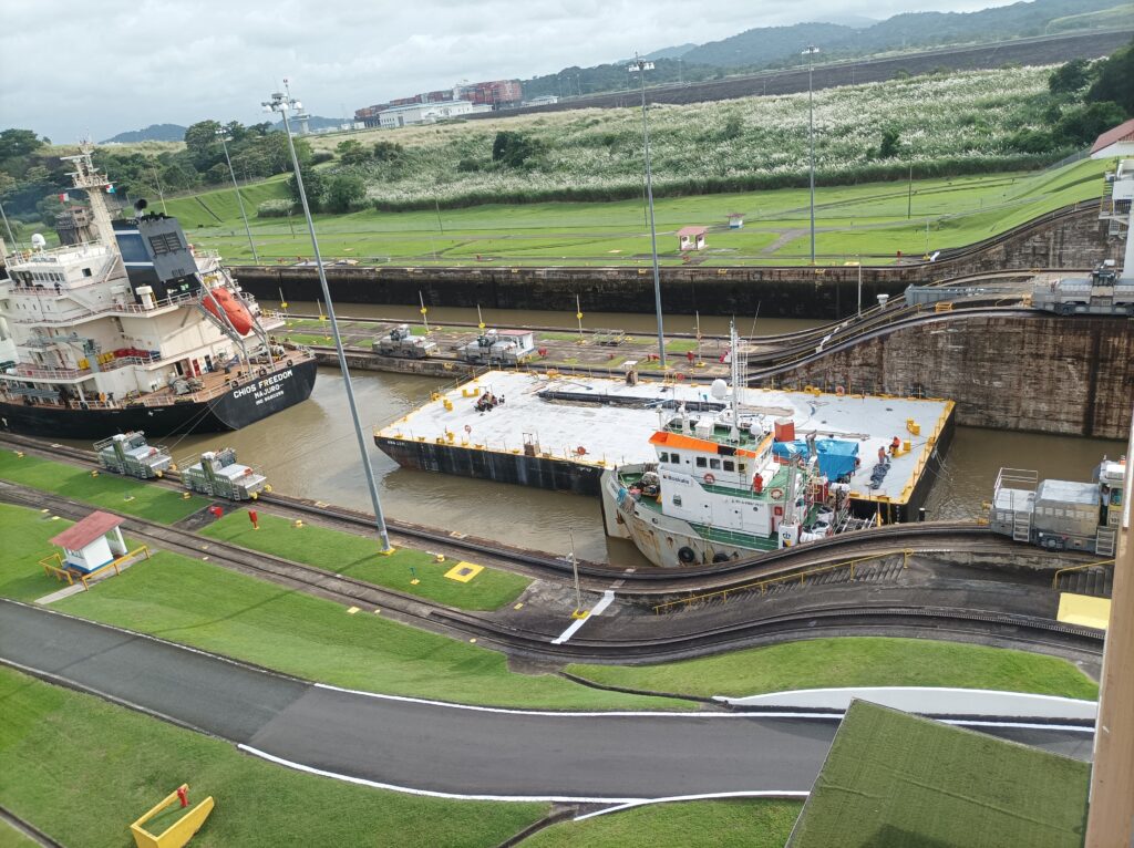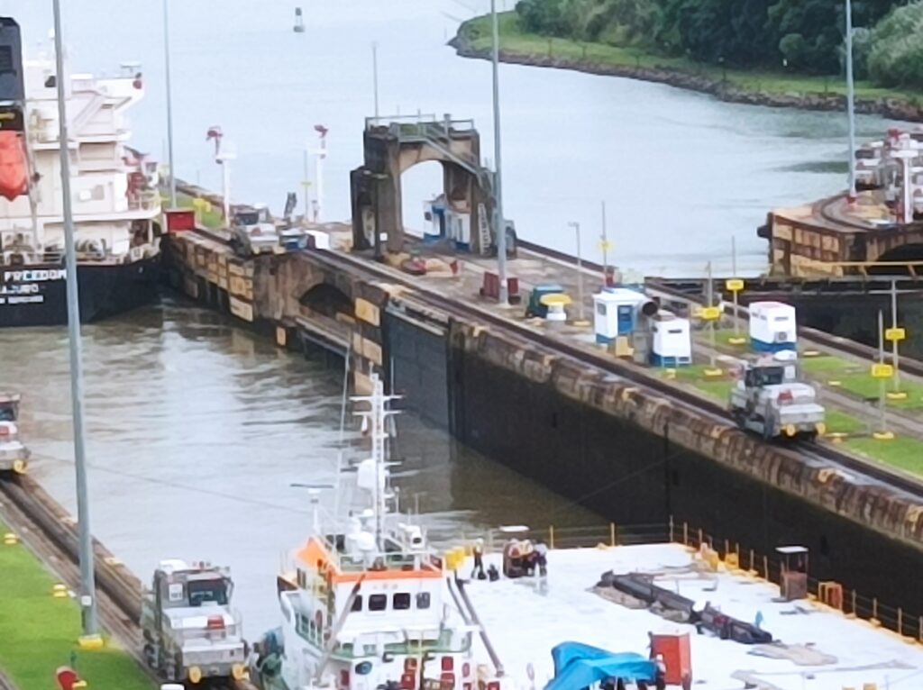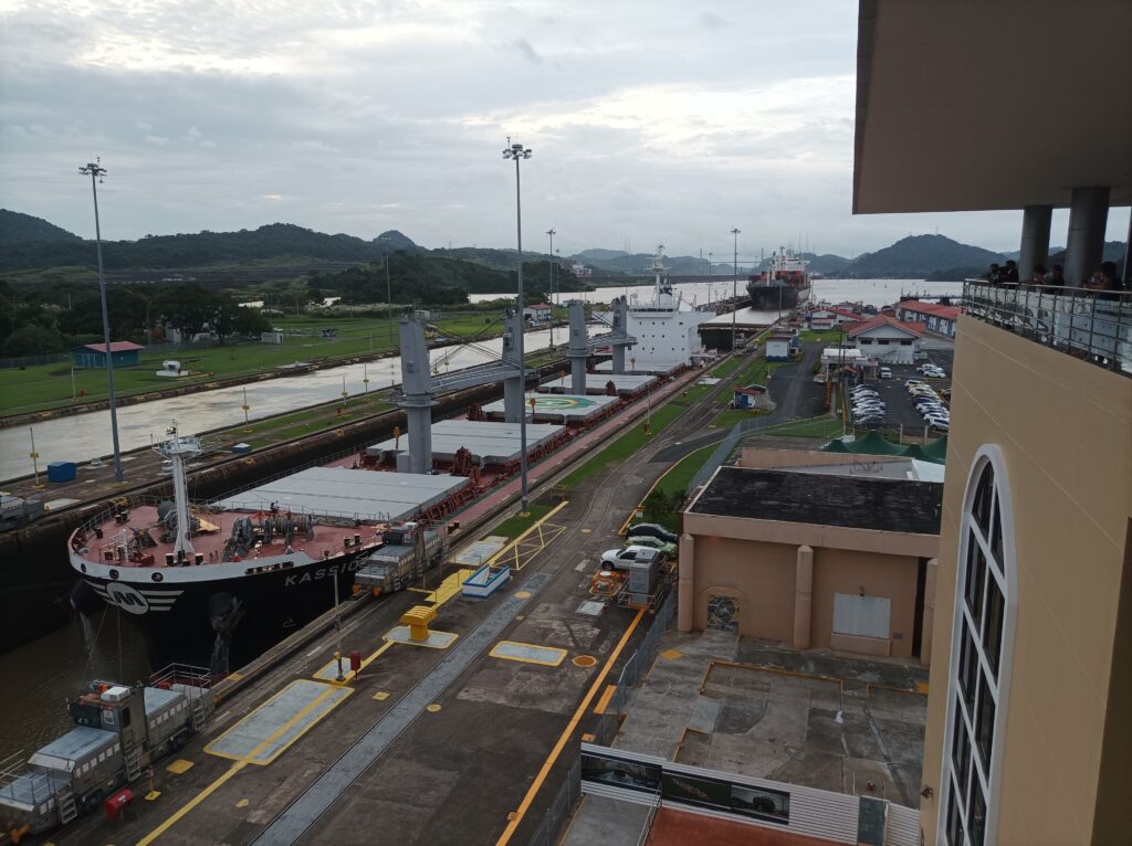 Hihtetlen látvány volt, ahogy betolják a hatalmas hajókat a zsilipkamrába, és hátul még sokkal hatalmasabb hajók kerülnek zsilipelésre… Kb 5 hajó zsilipelését nézhettük végig a látogatási idő alatt, nagyon gyorsan megy…