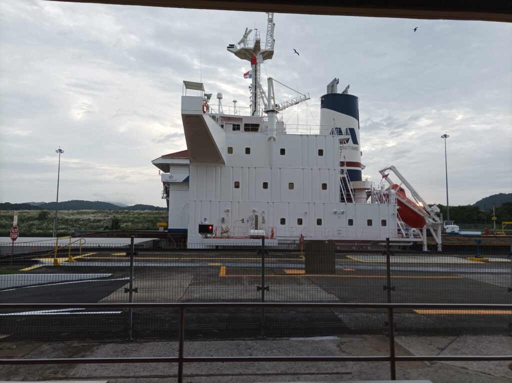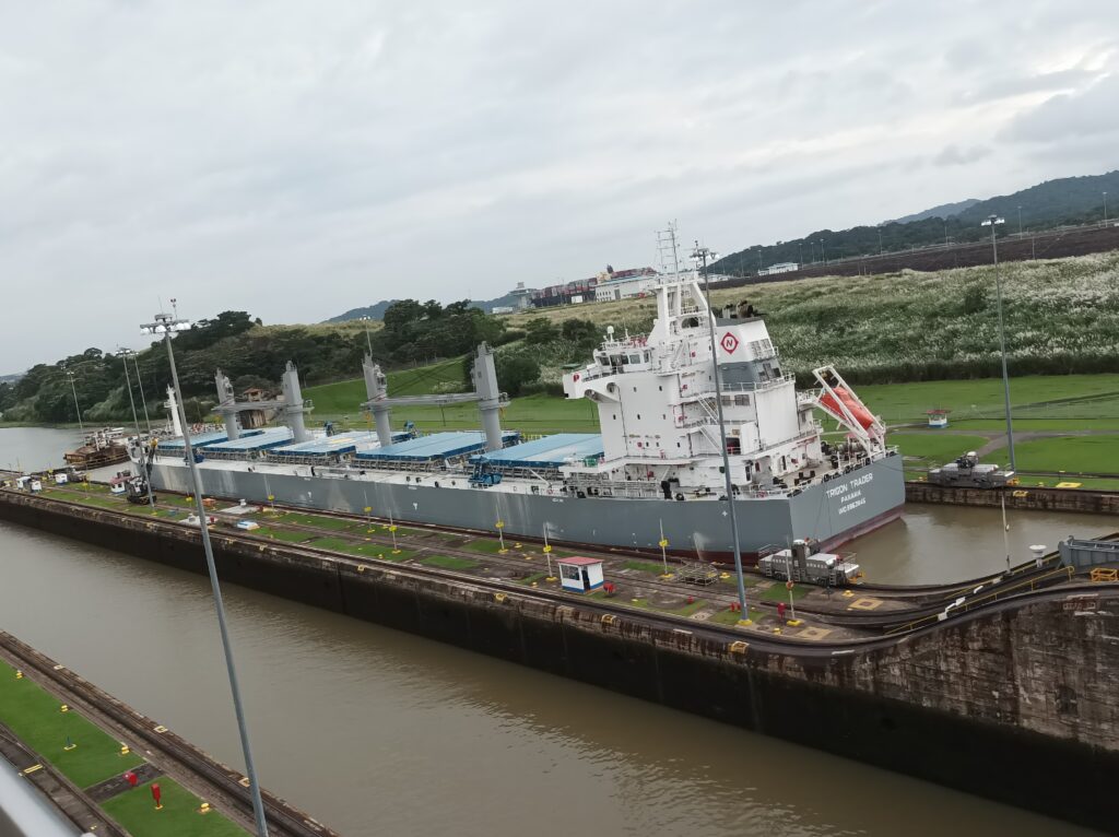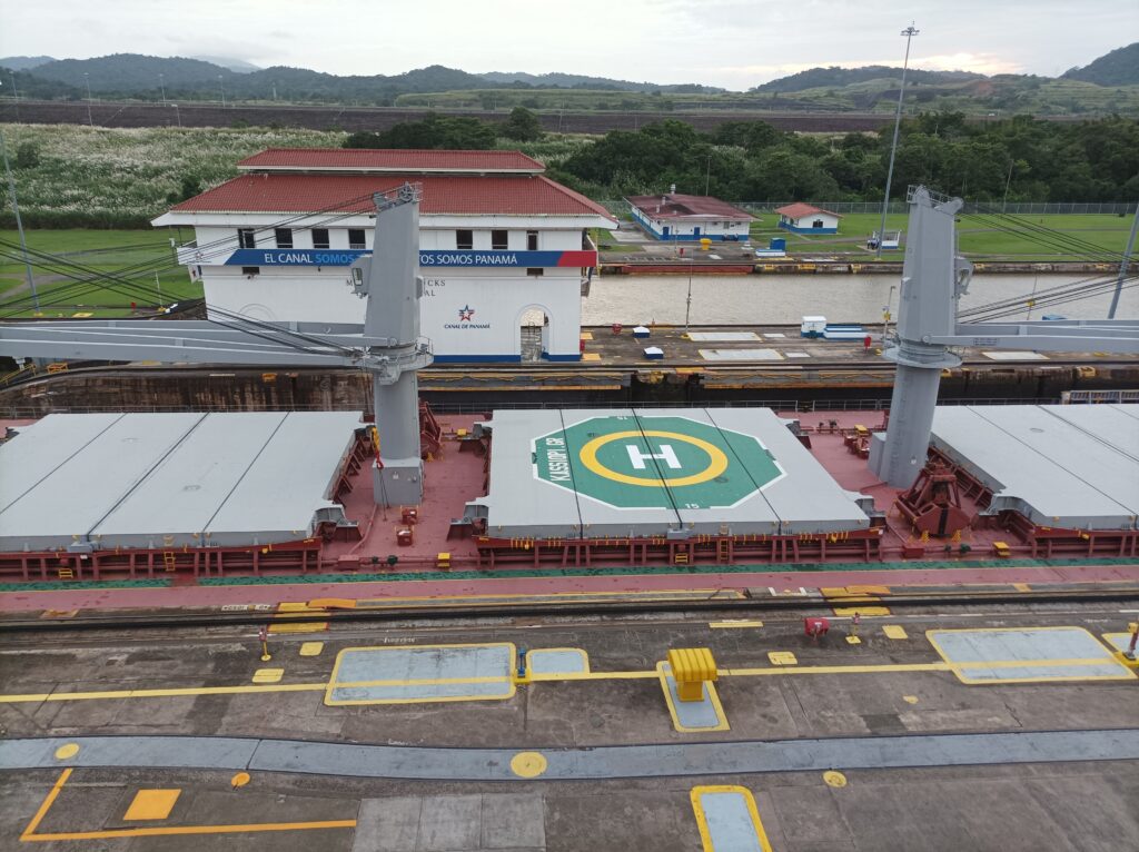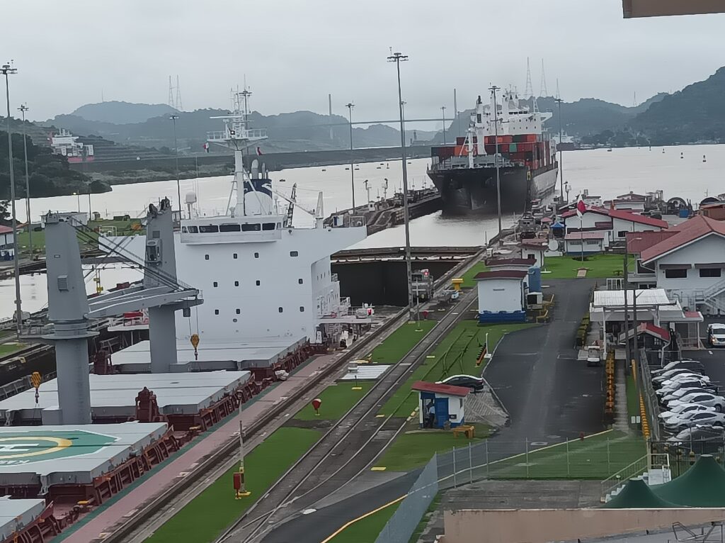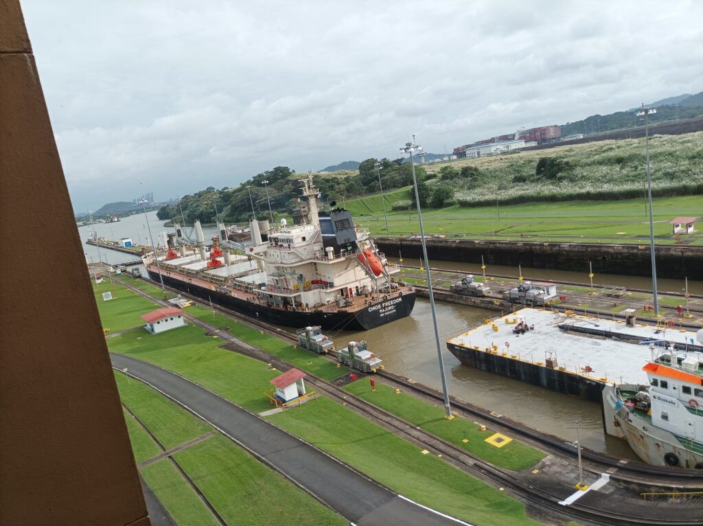Hihtetlen látvány volt, ahogy betolják a hatalmas hajókat a zsilipkamrába, és hátul még sokkal hatalmasabb hajók kerülnek zsilipelésre… Kb 5 hajó zsilipelését nézhettük végig a látogatási idő alatt, nagyon gyorsan megy…