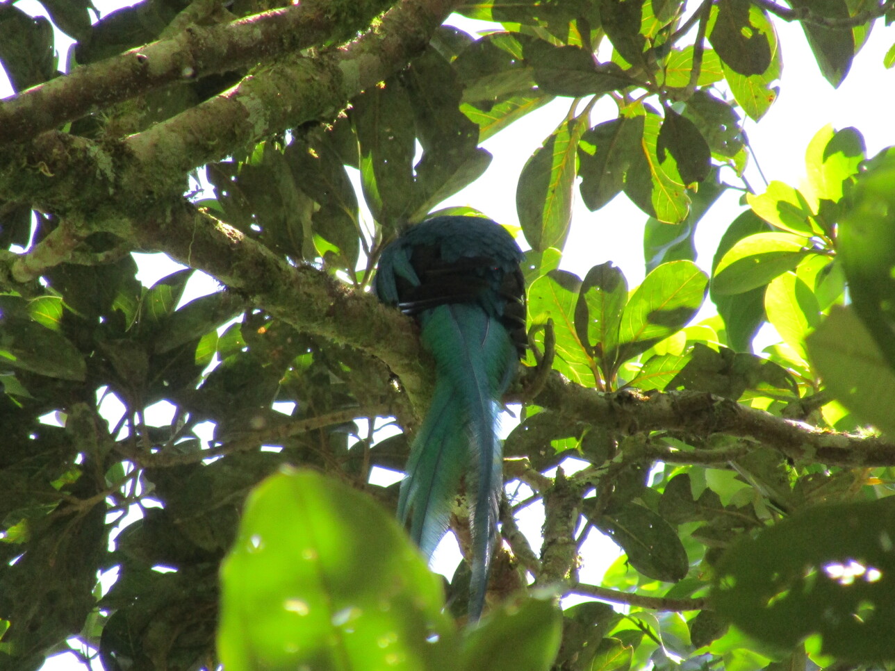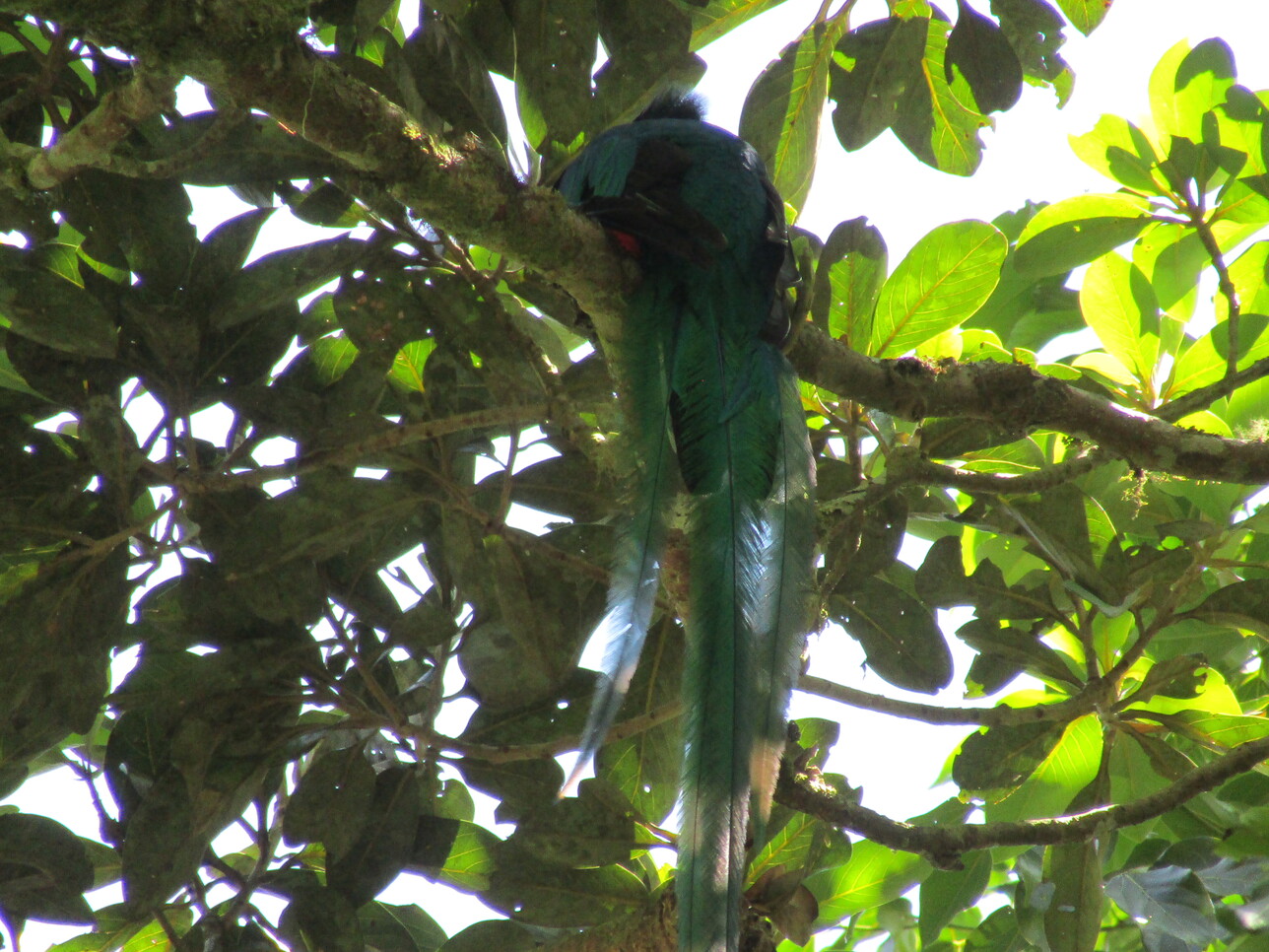 Folytatjuk a visszautat, elmeséljük az idegenvezetőnek hogy a kertünkben is volt egy quetzal. Kérdi hol, elmondjuk hol lakunk, s kedvesen feleli, nem akar minket megbántani de nem hiszi hogy quetzal volt, szerinte mot-mot madár. Az is volt, felelem, de az kisebb. Nem hiszi, de amikor megmutatom a tenyeremmel hogyan repült fel a fára, izgatott lesz – mint a sárkány, mondta, s látom már kezdi elhinni. Fehér farktollai csak repüléskor látszódtak, s a repülése egyedi a világon – valóban nem lehetett más. Ő se érti, mi se, hogy került ide egy Quetzal akkor – de a lényeg, itt volt. Végülis busszal 35 percre vagyunk attól a helytől, ahol most járunk s a közelben van magas fákkal teli erdő…