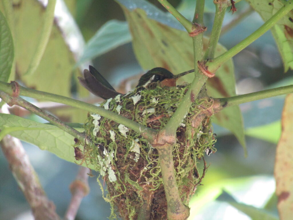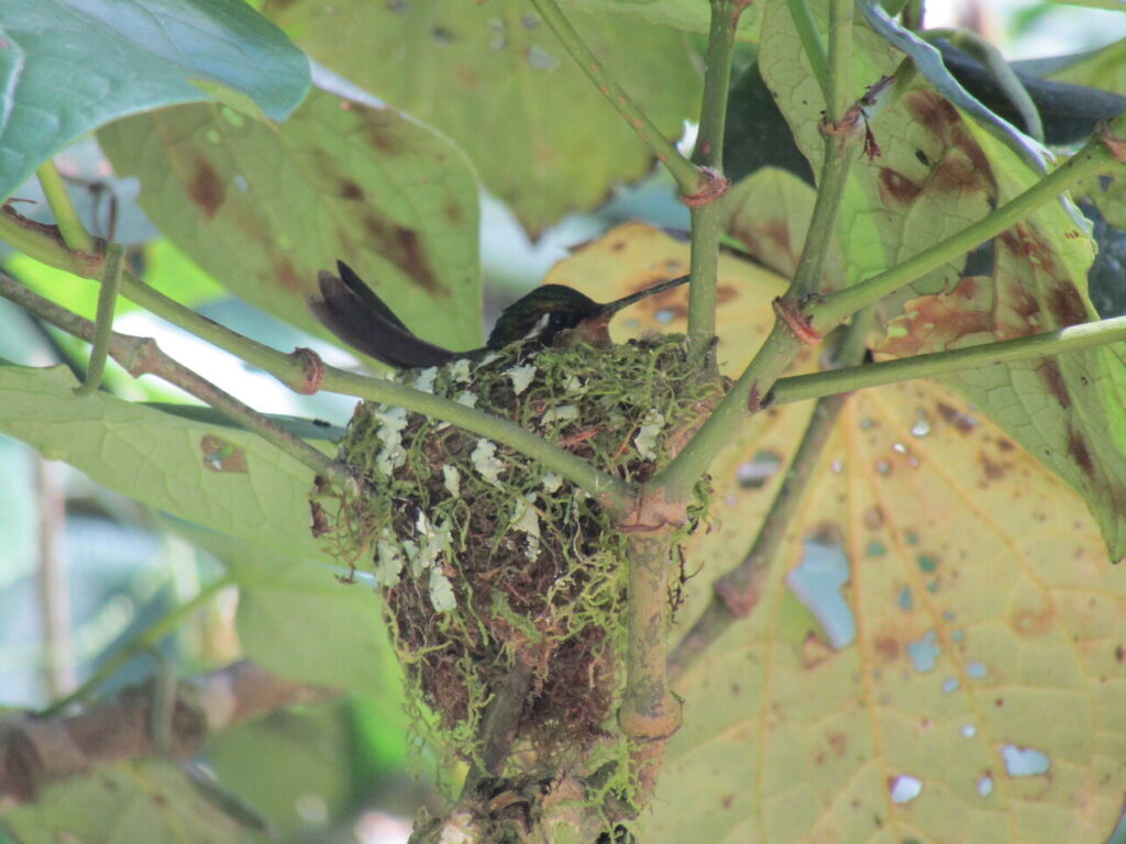 Ezután még egy kolibri fészket is észrevesz – mindenkit megkér ne menjen közel, onnan fotozzunk – kb 1.5 m-re a fészektől – mert a kolibri anyuka épp költi a tojásokat, ne stresszeljük. Nem stresszeljük, az anyuka nyugodtan költi a tojásokat mi meg fotozzuk, nézzük.